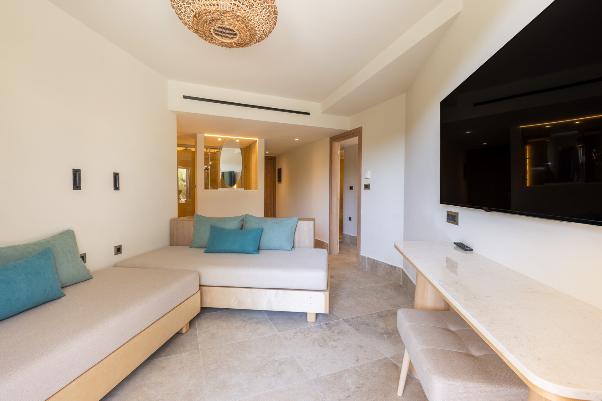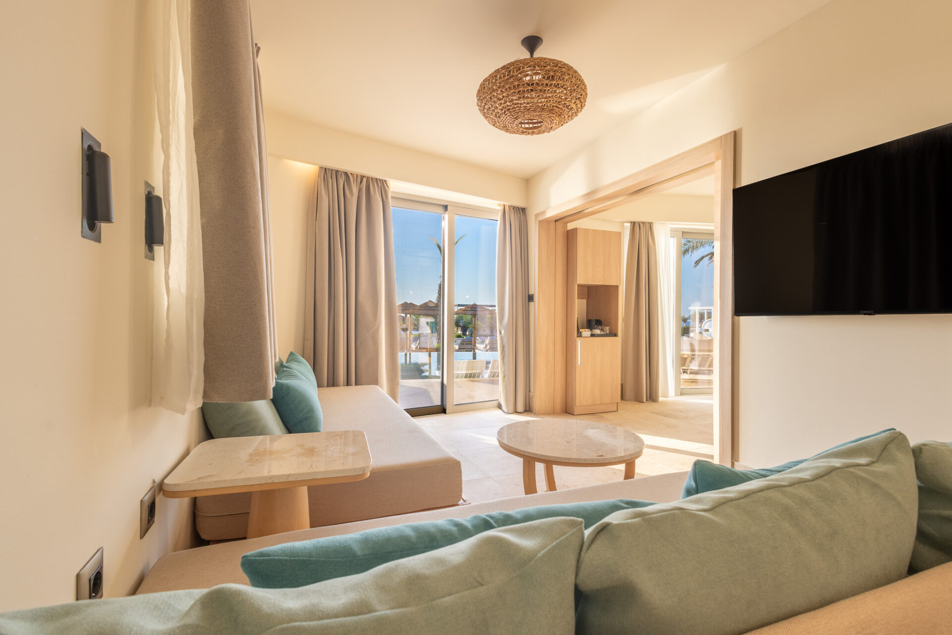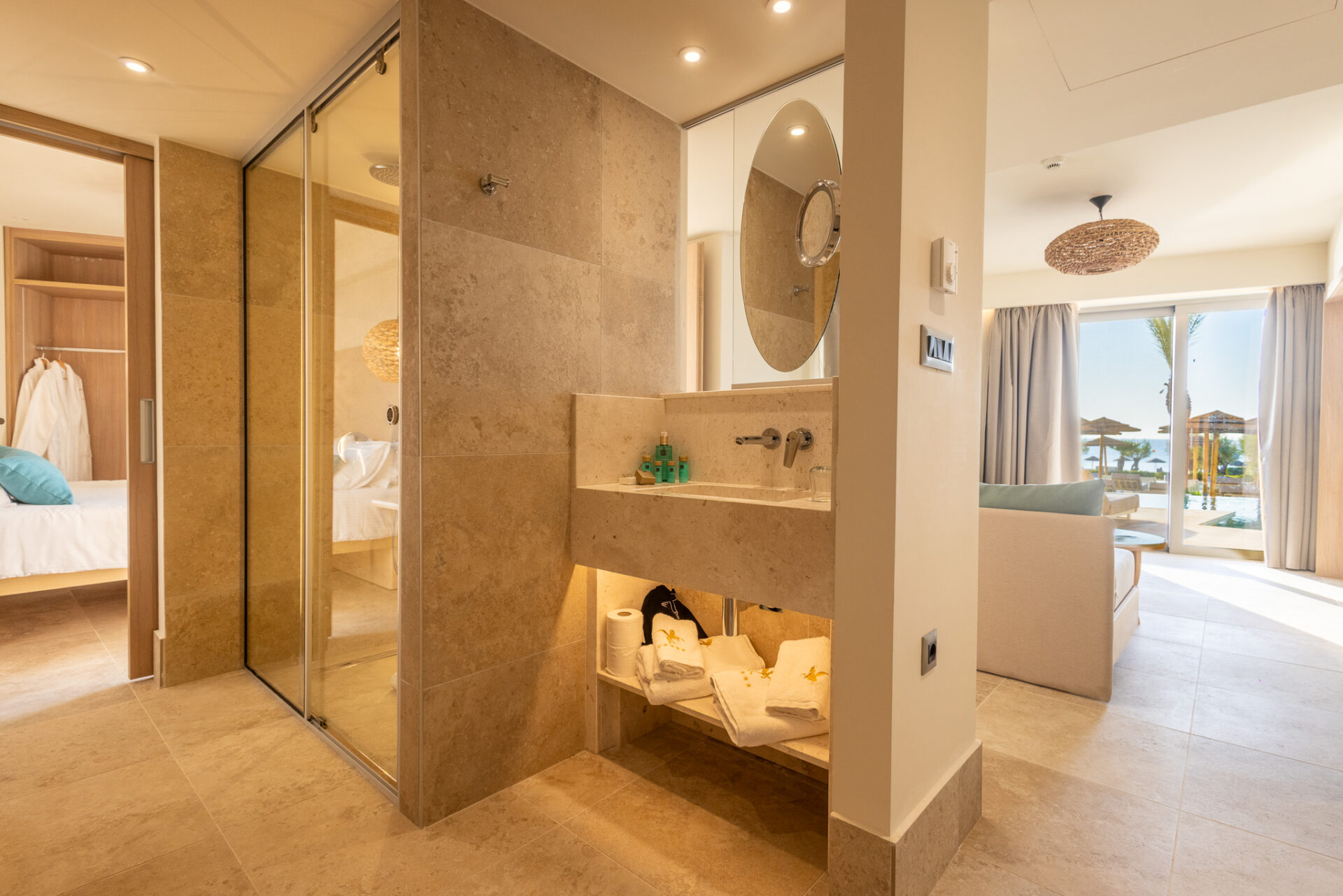 The 55 sq.m. Panoramic Suite with Sea view has been built with one goal in mind: to fully satisfy the senses!