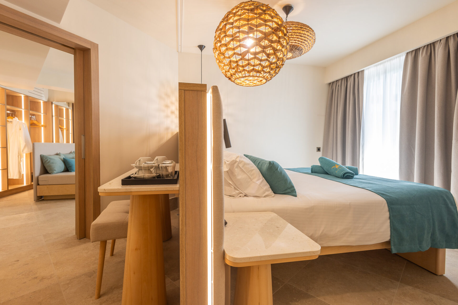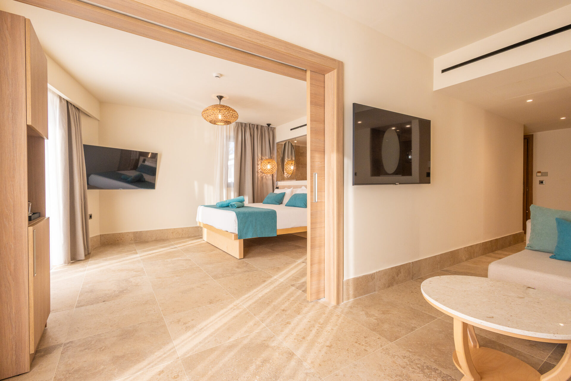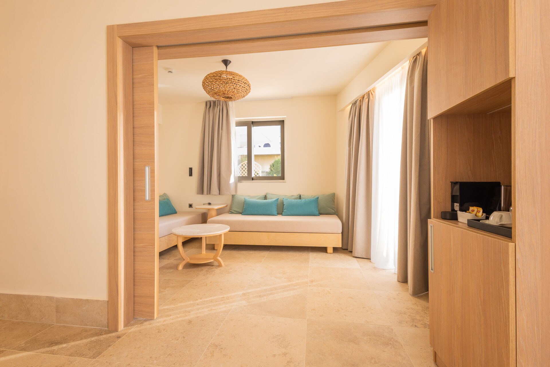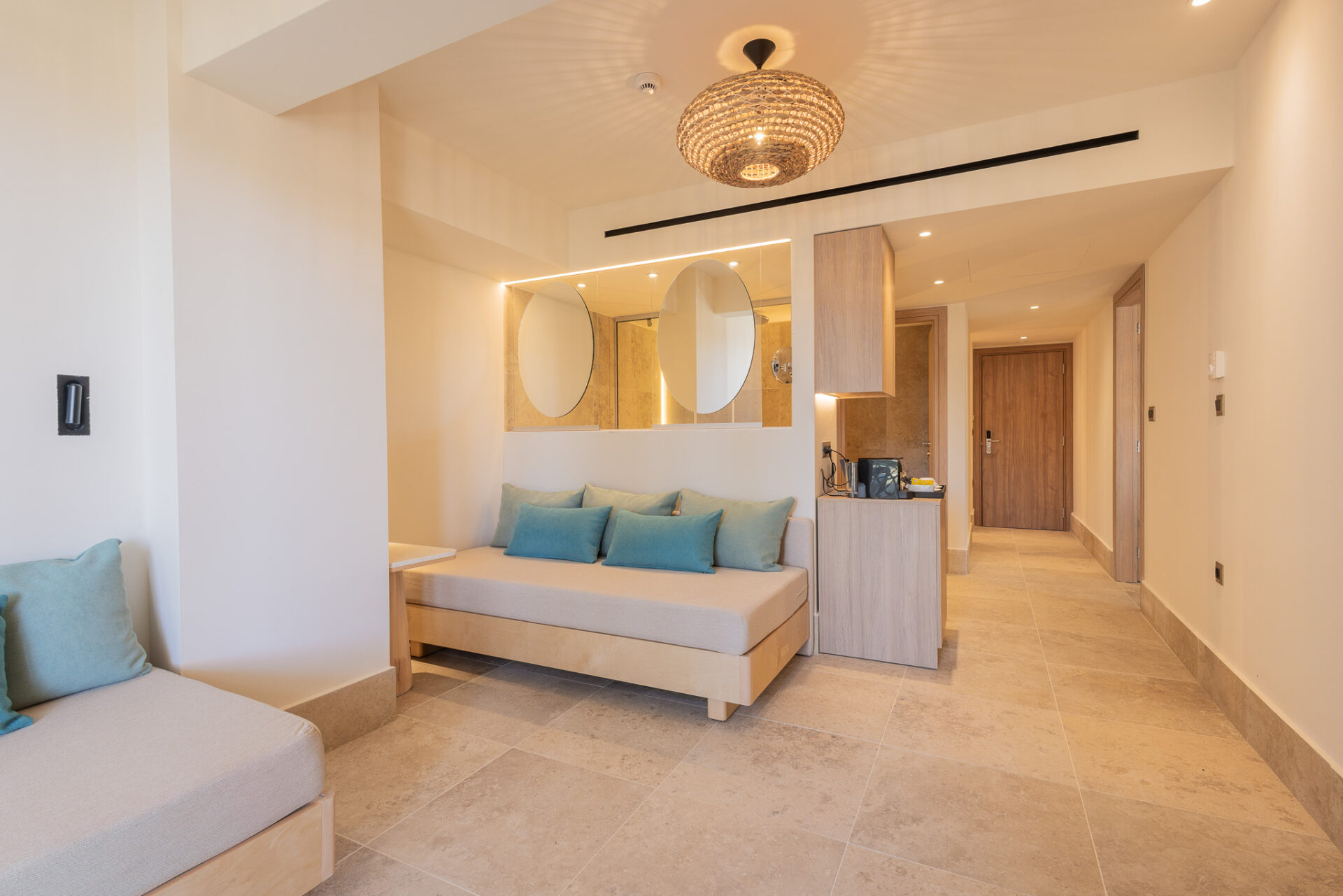 The 55 sq.m. Panoramic Suite with Sea view has been built with one goal in mind: to fully satisfy the senses!